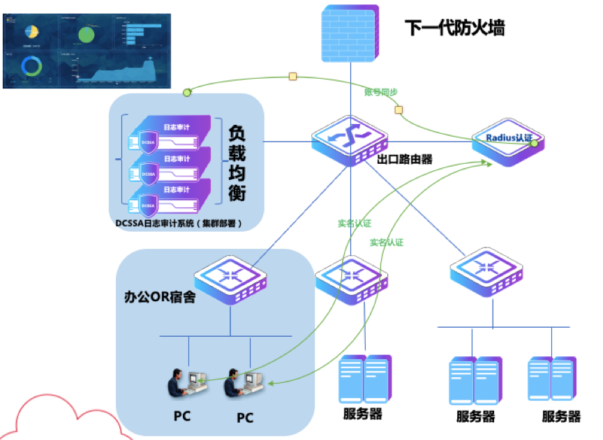 方案中顺利获得凯发k8国际数码DCSSA日志审计系统与安全防火墙、认证计费系统、行为审计等产品深度融合,实现DHCP动态地址场景下实名溯源,把用户地址、用户账号、用户行为、用户安全多元结合,当威胁事件出现时,可以让管理者快速定位,快速解决问题。