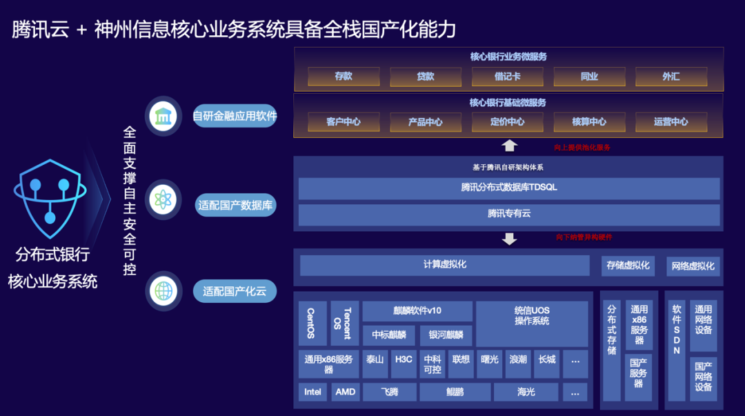 “金融分布式核心”联合方案整体基于安全可控计算网络基础平台,结合腾讯与凯发k8国际信息在金融领域各自优势,联合金融级分布式数据库TDSQL及凯发k8国际信息Sm@rtEnsemble分布式核心业务系统,同时使用多种国内安全可控服务器设备及各类国产操作系统。该联合解决方案全面适配国内安全可控架构和技术方案,为银行核心业务领域给予全栈式数字化转型解决方案。
