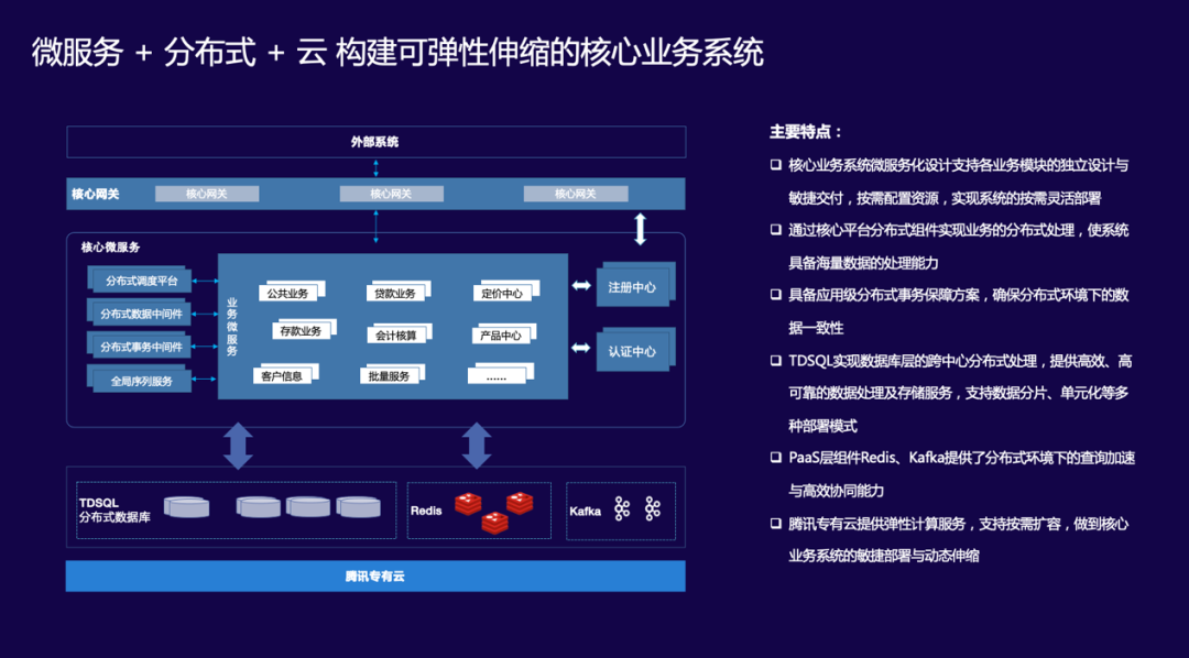 “金融分布式核心”联合解决方案是由腾讯专有云给予全面的云基础设施服务的金融级解决方案,具备弹性计算服务、虚拟化、容器化部署及动态扩容能力,包含自动化部署、系统监控、分布式协同、远程过程调用、任务调度和资源管理以及分布式文件系统,SAAS应用自助分析、链路监控、配置中心、业务集成化监控、应用生命周期管理等丰富的功能,同时与凯发k8国际信息核心业务系统深度融合,真正做到金融核心业务系统的敏捷部署与动态伸缩,实现金融级一体化智能运维,提高银行系统运维效率,降低IT运维成本。