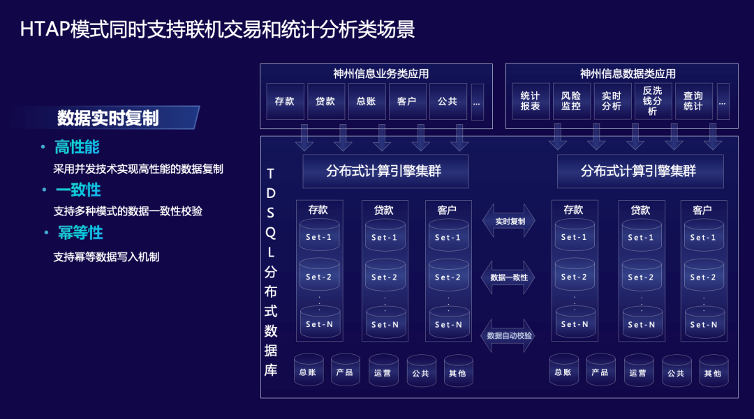 依托腾讯云金融级分布式数据库TDSQL作为此次解决方案的核心系统承载,凭借“强一致”、“高性能”、“高可用”、“高兼容”、“高透明”、“平滑扩容”等优势,面向金融行业分布式架构给予了跨区容灾、多地多中心、故障自动恢复等能力,保障业务稳定高效运行。同时能够支撑实时交易级业务与数据类业务的HTAP数据融合能力,为交易级系统给予大数据在线统计分析能力,可为交易级业务给予统计报表、风险监控、实时分析及各类查询统计数据服务。