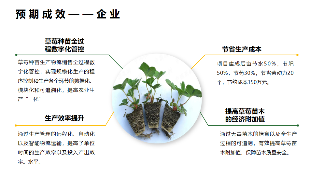 利用信息技术、物联网、云计算、大数据等技术手段,为产业生产全过程配套数字化设备,搭建智能监测、控制、服务、管理平台系统,集成展示草莓苗木数字生产、数字监管、数字仓储、数字交易、数字消费等内容,推行一部手机、一个触摸屏、一个码、一张图的时空信息管理模式,促进草莓育苗产业实行生产精准化、经营智慧化、销售精品化、服务在线化,从而提高农业生产效率和质量,促进农业可持续开展。