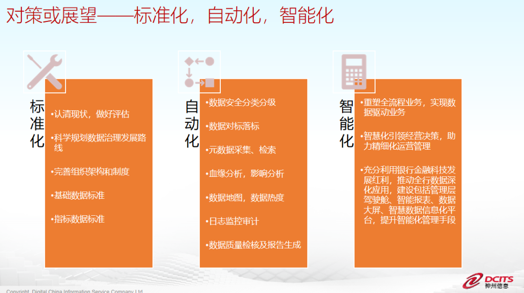 对于广大中小银行未来的数据治理工作召开,可以参考从“标准化”到“自动化”,再到“智能化”的路径逐步进行。