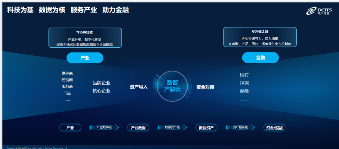 一方面,为产业侧给予全栈式的数据智能和数字金融赋能,助力核心企业及其上下游大量的中小微企业进行数字化转型,实现产业升级,使其专心做经营;