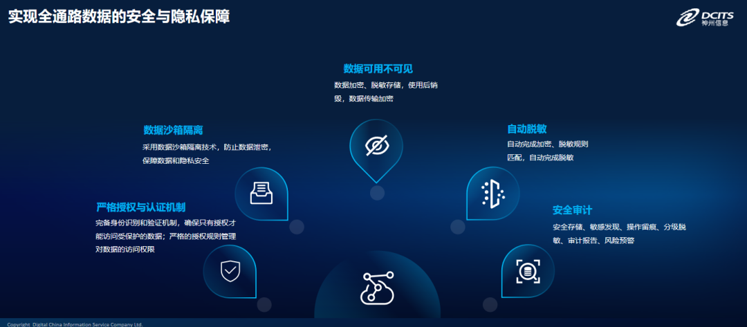 五是,给予安全存储、敏感发现、操作留痕、分级脱敏、审计报告、风险预警等安全审计。